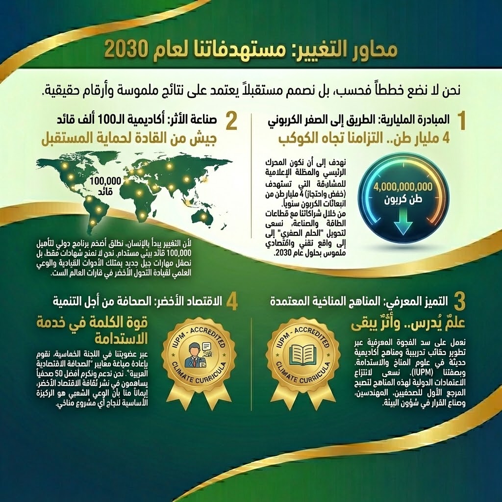 - الريادة المعرفية: تطوير حقائب تدريبية ومناهج مناخية حديثة واعتمادها دولياً لسد الفجوة المعرفية.